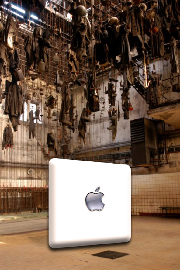 Vizualizace - Všestroj budoucnosti kráčí k šachtě, aby fáral do uhelného dolu. Odložené svršky propušťěných olivounských dělníků mlčky přihlížejí.