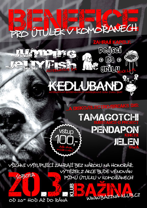 20. 3. 2010 | Klub Bažina, Komořany Spolupachatel Pejsci na grilu, Jumping Jellyfish, DJové Tamagotchi (Substance-D project), Jelen (Owa), Pendapon (Kinetix) Z výtěžku koncertu se nakoupí alkohol pro pejsky v útulku. plakát (jpg) |